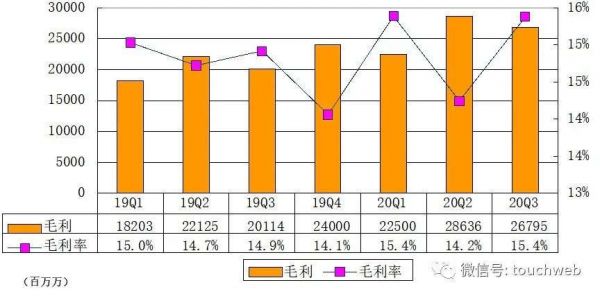 京东第三季度毛利为267.95亿,毛利率为15.4%,上年同期的毛利率为14.9%。