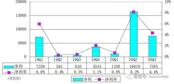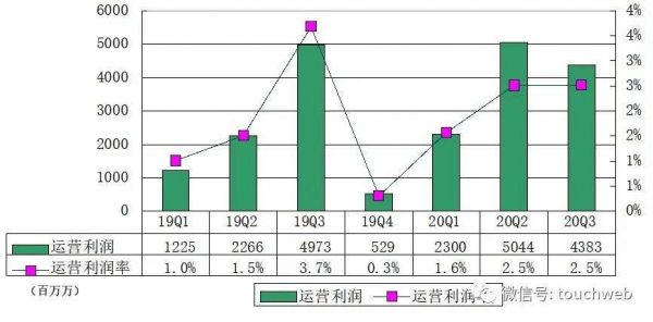 京东2020年第三季度经营利润为44亿元(约6亿美元),上年同期为50亿元,运营利润率为2.5%。
