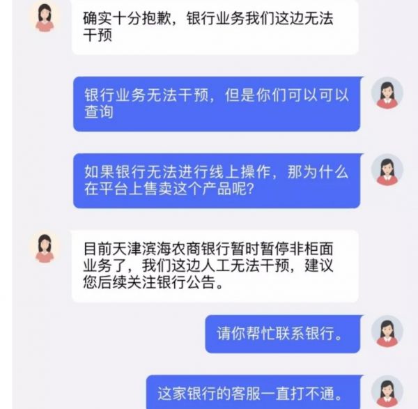 《锐问》获悉,一位京东金融用户去年购买了平台上的天津滨海城商行的一款理财产品,今年出现银行延迟提现的情况,多花了一个月时间才提现成功,约定利息也没有得到。