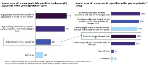 在Forrester的另一份相关领域的报告中,可以发现越来越多的企业开始重视自建AI能力,受访企业意愿比例从25%提升到了42%: