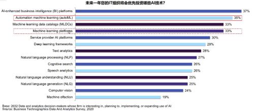 与此对应的是,一些可以帮助企业自建AI能力的核心AI技术,如在通用性上占有优势的平台型AI技术、可降低自建AI门槛的自动化机器学习(AutoML),成为企业优先投资的技术点: