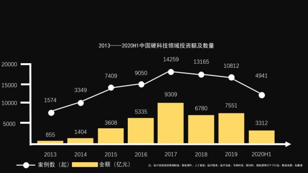 2020年上半年,中国硬科技领域投资额为3312亿元,在疫情及外部国际环境影响下,科技领域投融资依然保持一定活跃水平,体现了科技市场的成长性与弹性。