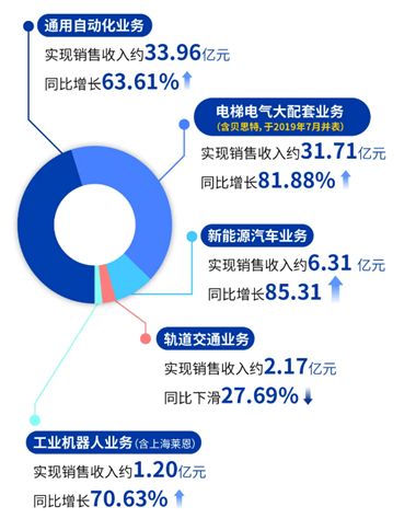 虽然其中电梯电气业务增长81.88%,是因为收购了上海贝思特电气并于2019年7月并表的因素,但汇川最大的通用自动化业务增长也在60%以上。