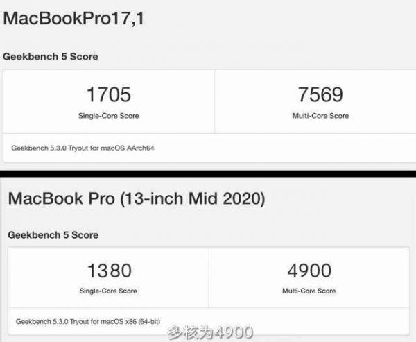 众所周知,Geekbench 5是当下测试CPU性能的重要跑分软件,目前苹果M1芯片的Geekbench 5单核分数普遍在1700以上,多核在7500以上,分数上甚至完虐去年苹果发布的MacBook Pro 16的i9处理器。