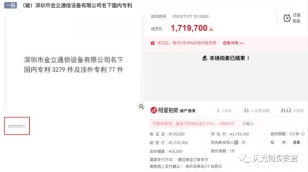 2020年11月17日,金立名下3000多件专利被打包拍卖,拍卖金额仅仅为172万元。