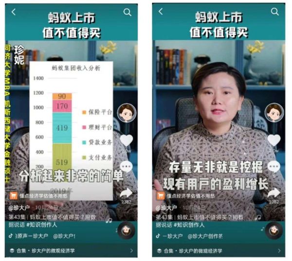 像今年年初抖音宣称的一样,要扶持知识科普类的视频。我跟一个大号“珍大户”还是微信好友,她是做财经视频的,前段时间蚂蚁集团上市,她发了一条视频《蚂蚁上市值不值得买》也火了,我利用碎片化的时间看了,能够从中学到一些东西或者获取一些信息,这对我来说是有用的。