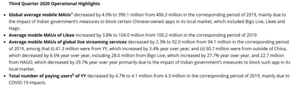 不过,YY作为被欢聚集团出售的业务,实际上在增长上就已经出现了乏力。比如Q3,YY直播移动端月活4130万,同比增长仅3.4%,YY的总付费用户数同比下降4.7%至410万,相比之下,欢聚海外业务收入表现强劲。