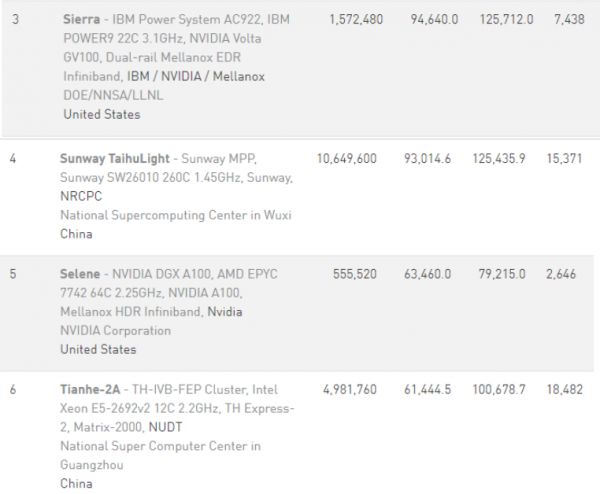 第三名是位于加利福尼亚州劳伦斯-利弗莫尔国家实验室的系统Sierra,以94.6 PetaFLOPS的HPL排名第三。其架构与Summit非常相似,其4320个节点中的每个节点都配备了两颗Power9 CPU和四颗NVIDIA Tesla V100 GPU。