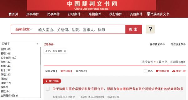 中国裁判文书网显示的与“金立通信”有关的裁判文书数量。