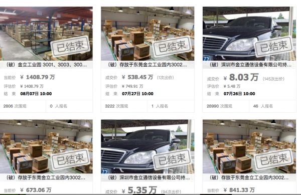 与此同时,金立旗下资产也陆续被拍卖。《凤凰WEEKLY财经》在阿里拍卖网注意到,金立旗下子公司金卓通信存放于东莞金立工业园内的两处物料部分正在拍卖中,总价合计近2000万元,其中一处尚在流拍中。此外,金立通信旗下几辆轿车也在疫情期间被拍卖。