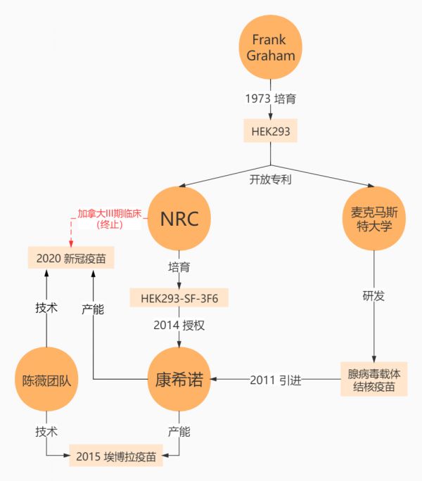 2011年,成立刚三年的康希诺与加拿大麦克马斯特大学签订合约,引进腺病毒载体肺结核疫苗(Ad5Ag85A)技术(相当于买下“图纸”);2014年,又花20万加元(现约合100万元人民币)从NRC引进HEK293-SF-3F6细胞系(相当于买下“生产线”)。