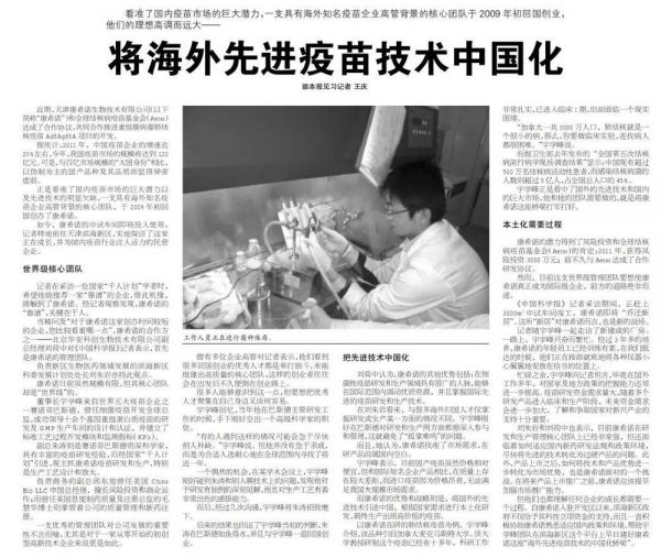 《中国科学报》2012年6月12日对康希诺的报道丨来源:中国科学网