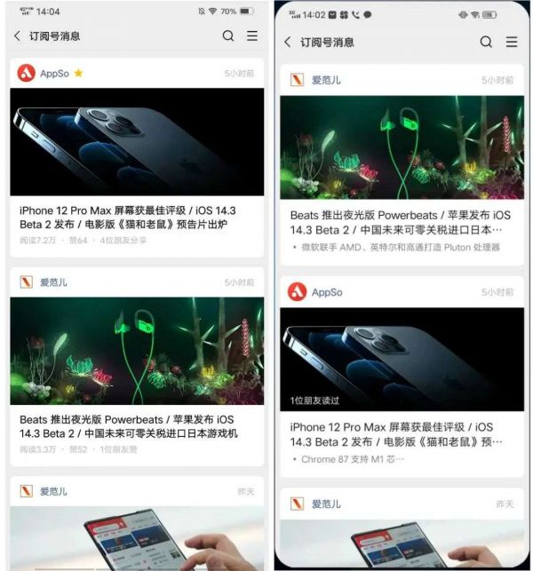 公众号页面改版是微信 7.0.21 for Android 内测版本的最大变动。