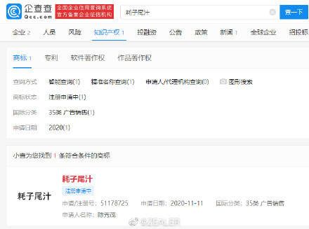 「耗子尾汁」是好自为之的意思。来自浑元形意太极拳掌门人马保国在一次视频中,他对两个年轻人的痛斥。企查查显示,耗子尾汁于 11 月 11 日被注册商标,国际分类为 35 类 广告销售,申请人为陈秀茂,商标类型为普通商标。