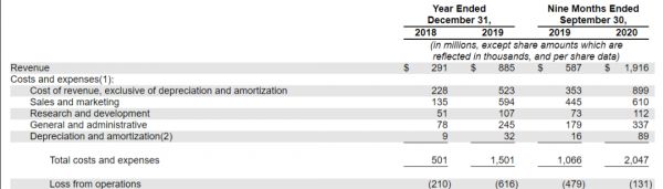 除了今年二季度首次实现单季度盈利之外,DoorDash仍处于亏损状态。2018年和2019年的净亏损分别为2.04亿美元和6.67亿美元。2020年前三季度1.49亿美元的净亏损则较2019年同期的5.33亿美元大幅收窄。