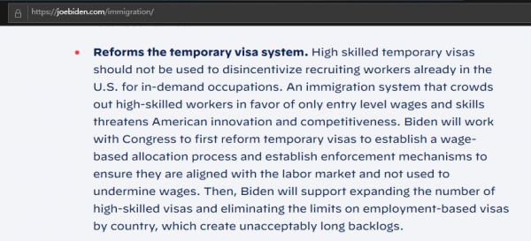 值得注意的是,拜登并非想要对 H-1B 彻底大开门。他的竞选官网上也指出,高技术人士临时签证不应该被过度使用,导致公司宁可雇佣外国人,也不愿意雇佣已经在美国境内的人士(包括美国人)。