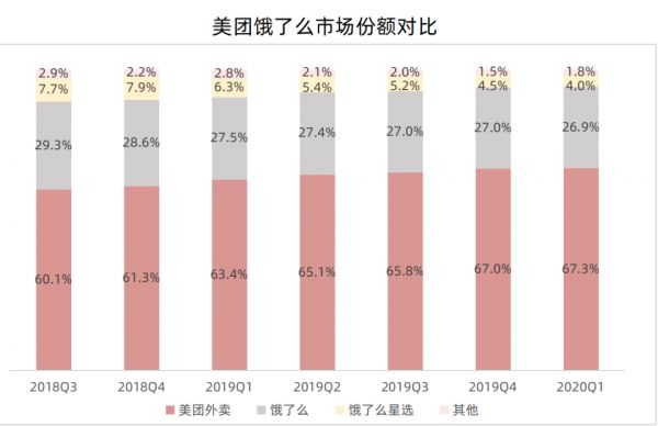 2019年四季度,根据第三方数据机构DCCI的报告,美团外卖在用户中的使用率最高,从外卖服务使用率来看,美团外卖和饿了么分别占比67.1%和32.2%。根据方正证券研报,从市场份额来看,今年一季度,美团外卖和饿了么的市场份额分别为67.3%和26.9%。