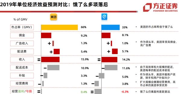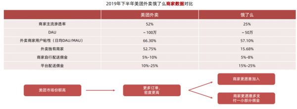 方正证券研报指出,2019年下半年,从商家端的角度来看,美团在商家渗透率、DAU、外卖独有商家三方面均领先饿了么,美团有足够的C端流量可以吸引商家,因此商家更愿意选择美团作为独家外卖平台。