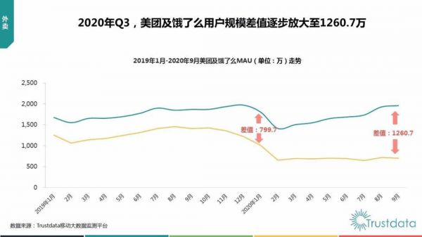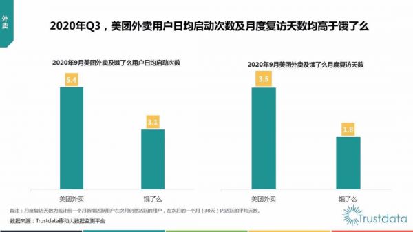 根据Trustdata《2020年Q3中国移动互联网行业发展分析报告》,2020年1月-9月,美团及饿了么用户差值逐步放大至1260.7万,美团外卖用户日均启动次数及月度复访天数均高于饿了么。