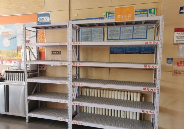 某商家店内外卖架实拍图,饿了么的货架空间不及美团外卖