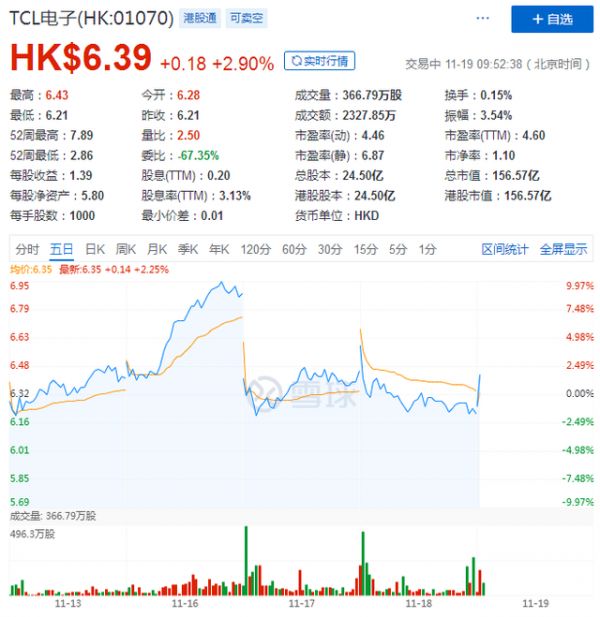北京时间11月17日,国内老牌家电企业tcl电子公布了2020年三季度的业绩报告。从财报核心数据来看,营收与净利双增的TCL电子收获了一份可喜的财报。但资本市场反应却出乎意料。当日港股收盘,TCL电子股价下跌6.25%,报收6.45港元。截至发稿,略有反弹2.9%,报6.39港元。