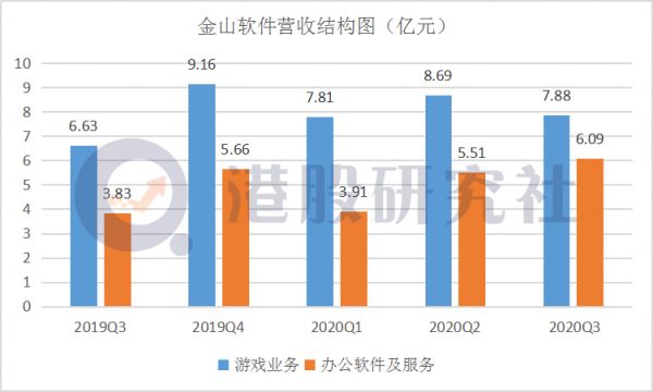 事实上,在金山软件三季度的营收结构当中,游戏依然是金山软件的营收主力,且已维持了很长一段时间。在港股研究社看来,这并不见得是一个乐观的表现。