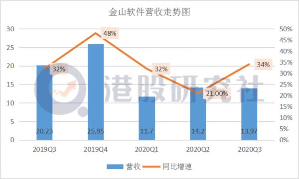 l 营收约为13.97亿元人民币,同比增长34%;其中,办公软件及服务、网络游戏业务的收益分别同比增长59%及19%;