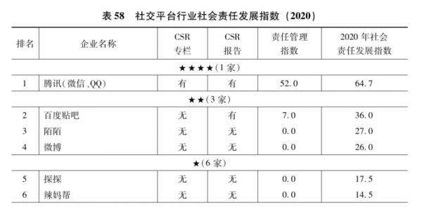 基于业务的优势地位,腾讯在社会责任上投入更多,建立了更健全的管理体制,也注重及时对外沟通,得到了四星评级。