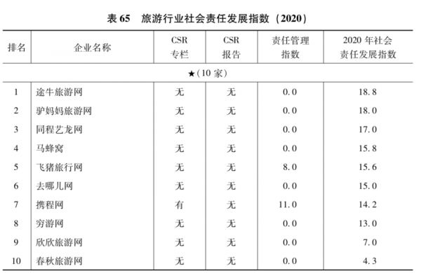 在线旅游行业出了不少大企业,包括途牛、同程艺龙、飞猪、携程等平台,不过它们在社会责任旅行上的表现不尽如人意。在选取的20个互联网行业中,在线旅游行业表现最差,全员处在一星级别。