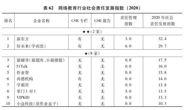 排新东方之后的是好未来,好未来与新东方均获得2颗星。其余包括猿辅导、51Talk、作业帮均为一颗星,得分在18分以下。