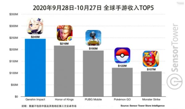 Sensor Tower数据显示,9月28日上市以来,米哈游《原神》迅速成为全球最受欢迎的游戏之一,并在30天内吸金2.45亿美元。