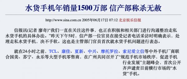 水货手机的历史比我们想象得还要久,2005年6月,TCL、康佳、夏新、中兴、摩托罗拉、索尼爱立信等厂商就联合国美、苏宁、永乐等手机经销,对猖獗的水货市场进行抗议,工信部也表态要对水货现象进行整顿。这场抗议的背景,是中国水货手机销量占据了全国手机总销量的三分之一,国产手机份额从50%锐减到30%。