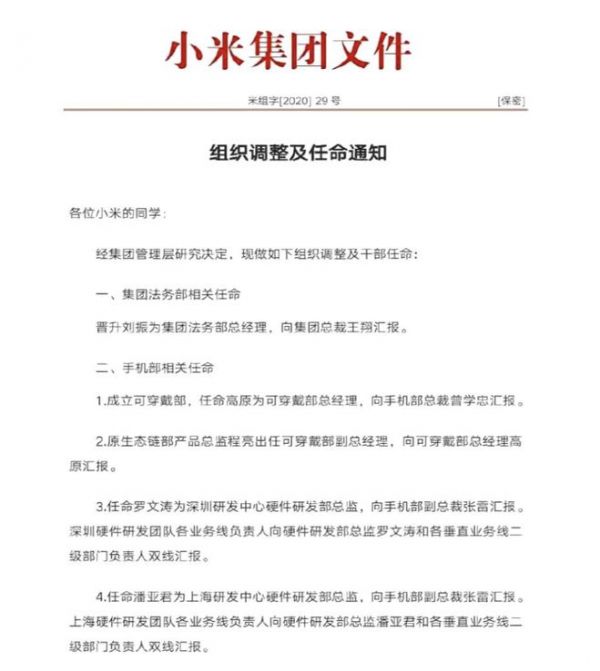 11月20日消息,据了解,小米集团发了一份机密文件,关于小米最新的组织调整以及任命。文件提到,成立可穿戴部,任命高原为可穿戴部总经理。