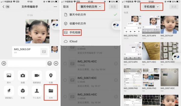 切换顶部菜单「聊天中的文件」为「手机相册」,就可以找到相册中的图片和视频发送了。