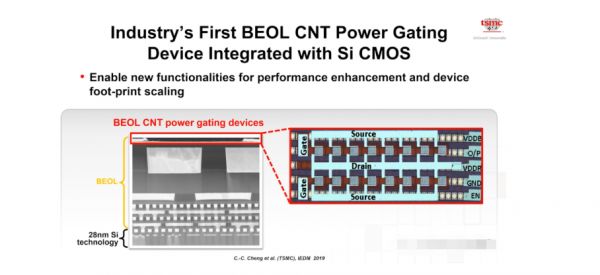 首先是其长期投入获得领先的技术研发优势。比如,为配合新制程工艺的良率,台积电在Nano-Sheet结构上面,已经成功生产出了32 Mb nano-sheet的SRAM,在低电压功耗上面具有明显优势;在2D材料上,台积电基于包括硫化钼和硫化钨在内的的2D硫化材料获得性能非常高的On-current;在电源管理上,台积电的研究人员用碳纳米管嵌入到一个CMOS的设计中,用来替代Power Gating的控制电流作用,给未来的进一步微缩提供新的思路。