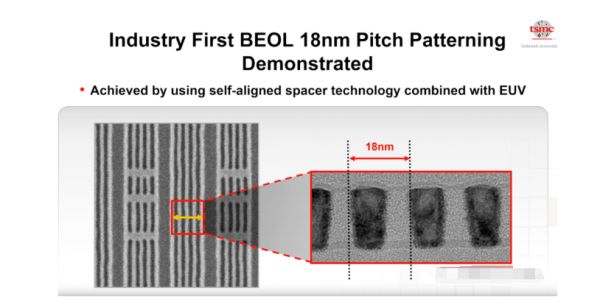 其次是台积电形成的长期的技术合作产业链。ASML作为早期和台积电建立合作的光刻机供应商,在为台积电提供设备的同时,也得到来自台积电的技术反馈。目前,台积电在在EUV光刻技术的OPC、光罩和光阻等多个方面都有投入,比如台积电在EUV技术结合上,采用自对准垫片获得了业内最小的18nm的mental pitch,对晶体管微缩大有帮助。