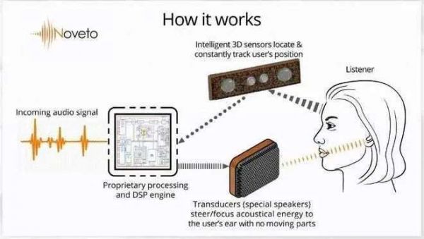 一个声音信号通过 DSP 芯片被转换成能够定向传播的超声波信号,扬声器将超声波定向投射到听者的局部空间内。3D 传感器事先定位并追踪耳朵的位置,并在耳朵周围形成一个「声音口袋」(sound bubble),从而让听众听到「立体声」。