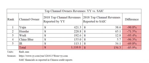 其三,质疑管理主播的公会也参与造假。根据对比欢聚时代的财报和五大公会的企业征信报告,浑水质疑,2018年这些公会的收入不到欢聚时代公布的15%。