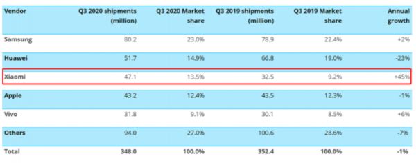据 Canalys 的报告,在 2020 年第三季度,小米挤进全球智能手机市场前三,同比增长 45%,占据 13.5% 份额。