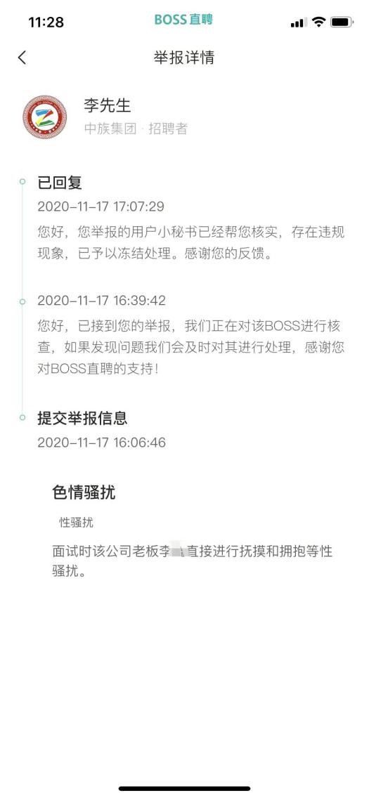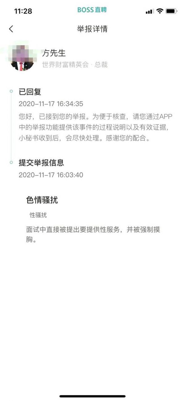 11月17日下午,新京报记者对世界财富精英会、中族集团两家公司发布的相关岗位进行了举报。约30分钟后,记者接到了BOSS直聘客服来电,询问具体情况。BOSS直聘客服告诉记者,遇到性骚扰的行为,可以在平台上该职位发布页面选择举报,填写完举报信息后会有工作人员在1-3个工作日给到反馈。客服还提醒记者后续在求职过程中要提高警惕,视自身具体情况考虑是否报警。
