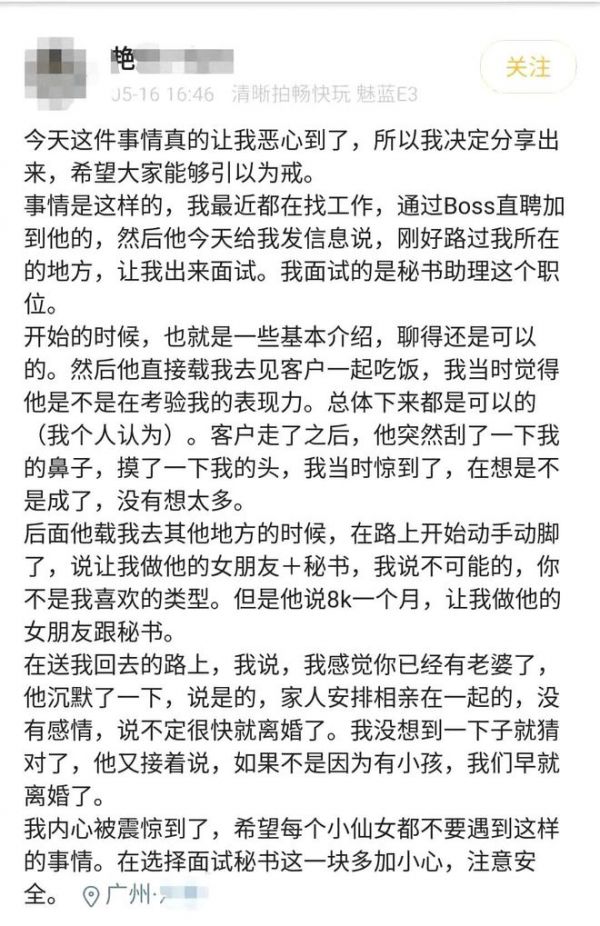 同在五月,广州网友艳艳在BOSS直聘上应聘秘书助理职位,直接被老板载去陪客户吃饭,“客户走了之后,他突然刮了一下我的鼻子,摸了一下我的头”。老板在路上对艳艳动手动脚,还开价每月8000元要求艳艳做他的女朋友兼秘书。