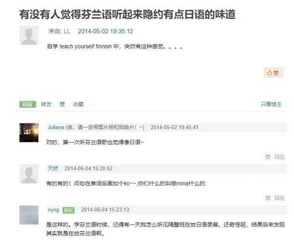 芬兰语和日语上却有很多相似之处,甚至还有些读音完全一样的词。在芬兰语中,芬兰叫做Suomi,听上去就像一个日语词。这个词没有任何意义也没有历史可查,好像就像凭空想象出来的。
