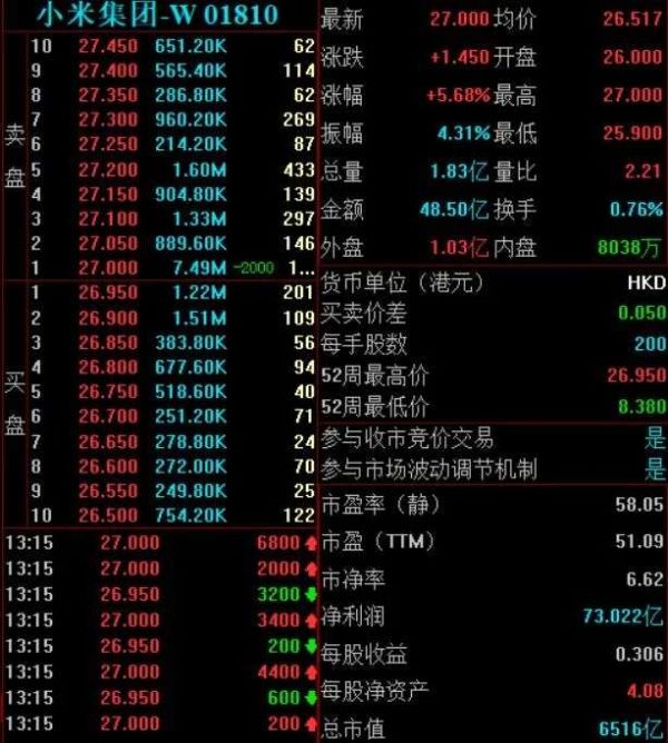 11月23日午后,小米集团大涨5.68%,创历史新高,市值超6500亿港元。