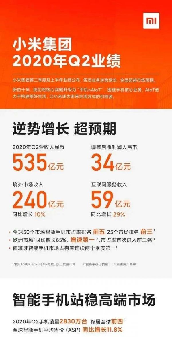 到了Q2小米的增长也非常不错。Q2小米收入达到人民币535亿元,环比增长7.7%.小米智能手机销量为2830万部,收入达人民币316亿元,占总收入60%。小米全球智能手机出货量也继续保持排名全球第四。同时,小米也成为了欧洲市场增长最快的手机厂商之一,同比增长64.9%,市场份额达到16.8%,首次排名前三。