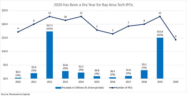 投资分析机构Renaissance Capital统计,截至今年8月中旬,硅谷没有一家公司成功IPO(常规途径),而在去年这个时候已经有9家公司成功 IPO。大部分公司受到疫情对业务,对组织架构和工作方式,以及对融资节奏的严重影响,这也是为什么人们一度认为2020年是硅谷IPO的旱季。