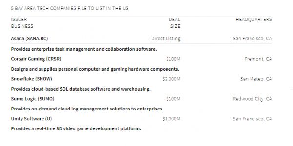 而在8月24日的那个周一,突然有13家公司宣布启动上市流程,其中就有五家总部位于硅谷的科技公司(四家软件公司 Asana、Snowflake、Sumo Logic 和 Unity,一家游戏硬件公司 Corsair),显著提高了人们对于2020年科技股的信心。