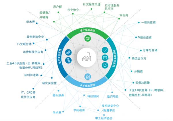 制造企业靠自己保持快速的数字化转型节奏是困难的,在其规模化地顺应新时代的过程中,生态系统能为其带来更高的产能与灵活性。在此关系的影响中,生态系统中多对多关系的成功可以惠及系统中的所有参与方,从而达到多赢的效果。
