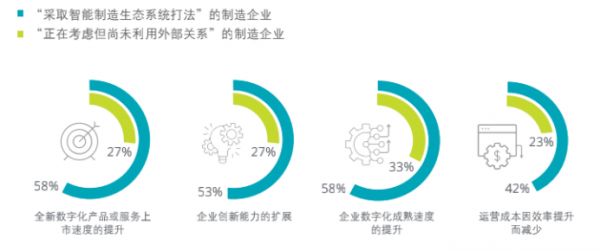 问卷中使用生态系统方法进行智能制造的制造企业通过合作伙伴带来的额外连接及能力而受益匪浅的概率是其他企业的两倍多。