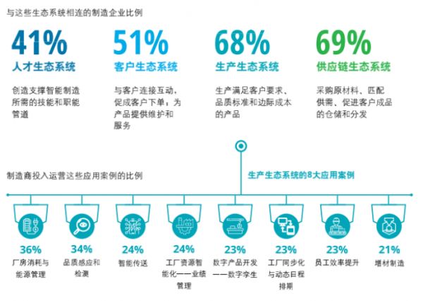 经调研发现,制造企业中寻求构建或正在实施这四大生态系统的比例分别为68%、69%、51%和41%。