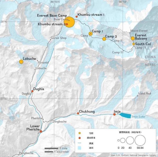 通过对在登顶路线上采集的11个雪样和8个溪水样本进行微塑料分析,纳珀与同事在每一份雪样和3个溪水样本中都找到了微塑料,这其中就包括海拔8440米的珠峰平台(Balcony)——研究团队在这里发现了已知全球最高的微塑料。